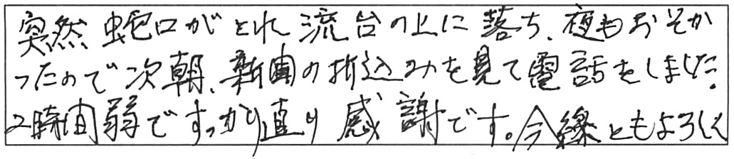 突然、蛇口がとれて流し台の上に落ち、夜もおそかったので、次朝、新聞の折込みを見て電話をしました。