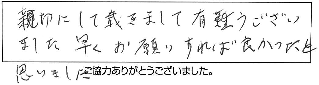 作業にきて下さった方も、手早く、処理して説明もして下さり気持ちよくお願いできてありがとうございました。