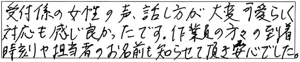 受付係の女性の声、話し方が大変可愛らしく対応も感じ良かったです。