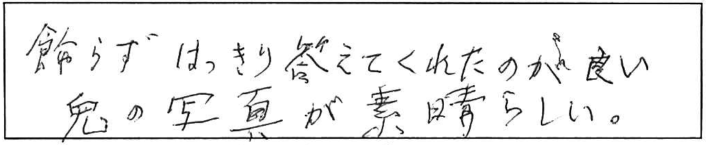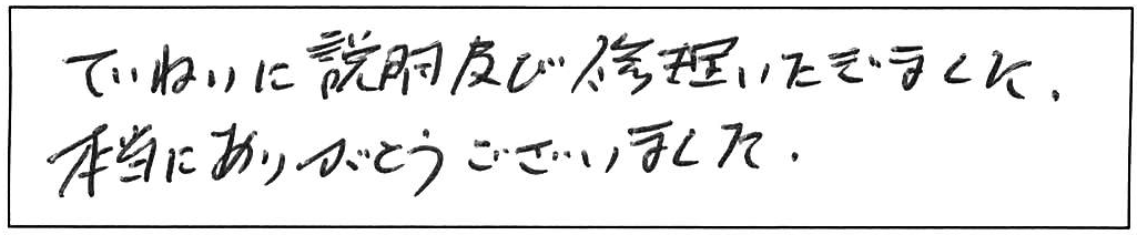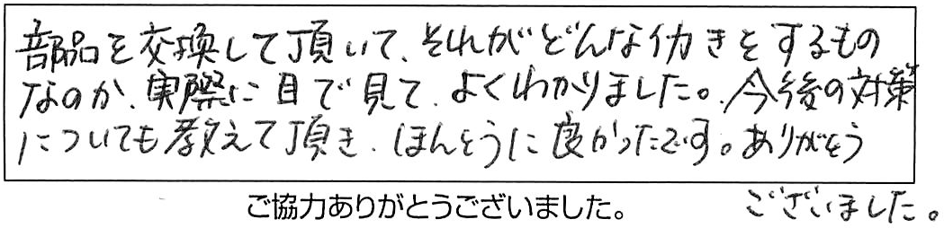 部品を交換して頂いて、それがどんな働きをするものなのか、実際に目で見てよくわかりました。今後の対策についても教えて頂きほんとうに良かったです。ありがとうございました。
