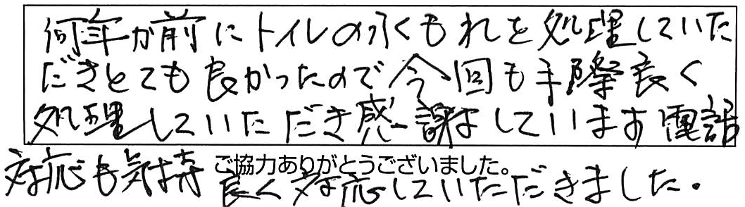 何年か前にトイレの水もれを処理していただきとても良かったので今回も手際良く処理していただき感謝しています。
